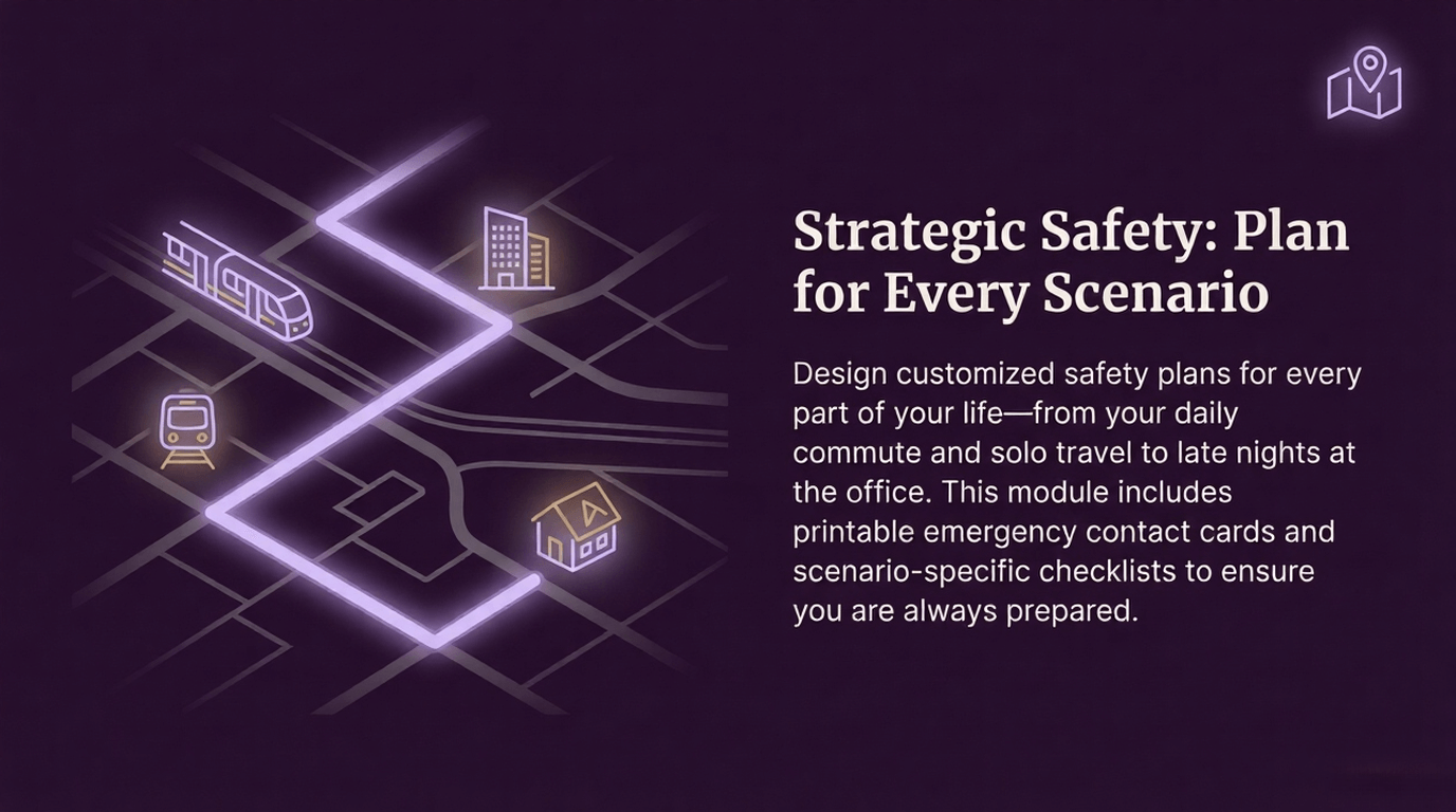 Yes! Module 7 includes specific protocols for staying safe while traveling, including hotel safety, transportation security, and area assessment techniques. The bonus Travel Safety Checklist Collection gives you step-by-step guidance for 17 different travel scenarios. Many of our customers are professional women who travel solo for work and report this system has been game-changing for their confidence and safety.